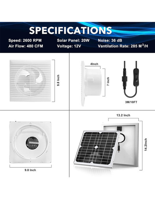 Solar Powered Exhaust Fan Pro, 20 W Solar Panel + 8 Inch High Speed Exhaust Fan