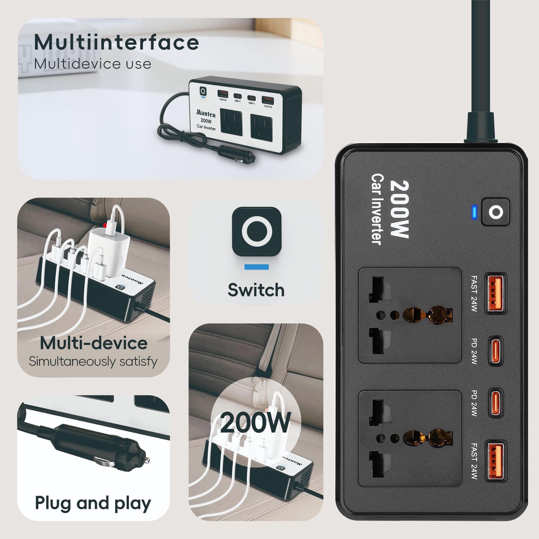 - 〖Car power inverter〗This Car power converter is equipped with 2 U.S. standard AC outlets, 4 USB charging ports, DC 12V to AC 110V converter,perfect for charging electronic devices such as laptops, tablets, cell phones, Christmas gifts, light strings and so on.