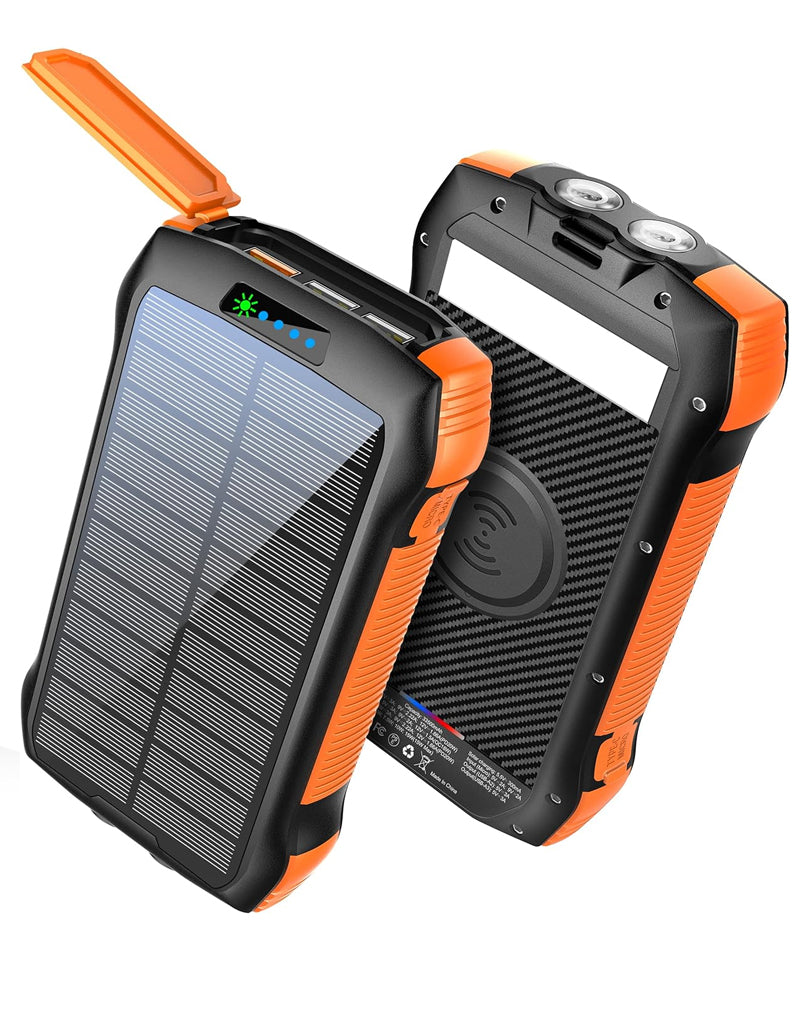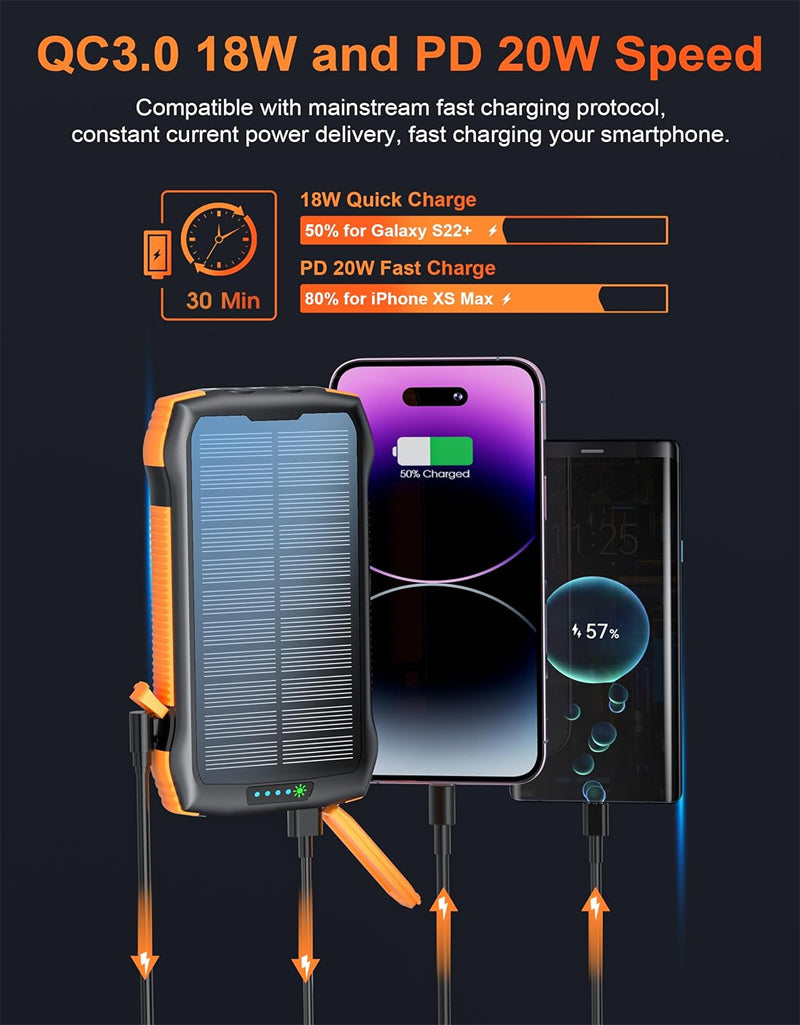 - Super Fast Charging: with QC3.0 18W USB A1 and PD 20W USB C output port, 10W wireless charging fits iPhone android cell phones (NOTE: Short press before use). micro and Type-C dual input, only need 6H to refuel by 20W adapter, this solar portable charger can charge 5 mobile devices sync.