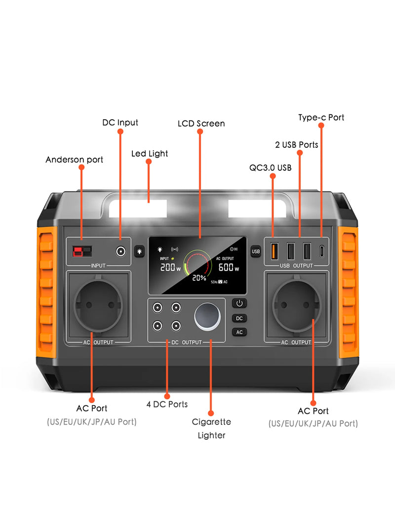 - Multi-Device Charging: Power up to 8 devices simultaneously. Featuring 1* 600W/110V AC outlet, 1* PD 100W USB-C port (input/output supported) , 1* PD 24W USB-C port, 2* fast charge 3.0 port, 1* Car Port and 1* DC port. It can charge many small devices, such as Laptop,Drones, Cameras